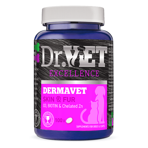 DERMAVET je preparat bogat omega 3 masnim kiselinama (poreklom iz osušenih algi), biotinom, kvalitetnim pivskim kvascom, jakim B kompleksom, helatnim cinkom.
