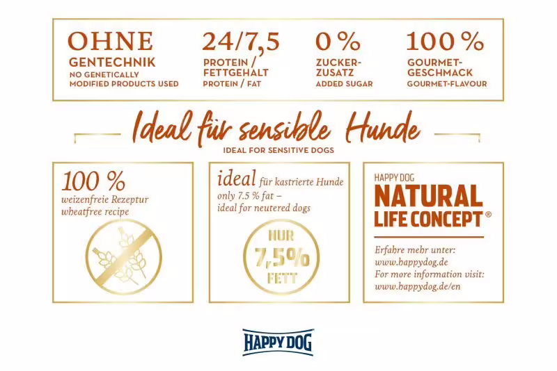 Happy Dog Sensible Toscana predstavlja jedinstvenu formulaciju namenjenu ishrani odraslih pasa srednjih i velikih rasa sa posebnim potrebama. Ova izuzetno ukusna hrana sadrži više vrsta mesa (pačetina i losos) i pažljivo odabrane sastojke koji osiguravaju uravnoteženu ishranu. Mediteransko bilje poput ruzmarina, kadulje i lavande pruža prirodnu podršku imunom sistemu, dok visok sadržaj omega-3 i omega-6 masnih kiselina doprinosi zdravlju kože i sjaju dlake.